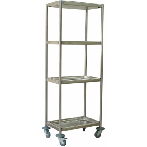 Каркас изготовлен из нержавеющего стального профиля. Установлен на поворотные колесные опоры  диаметром 75 мм, две из которых с тормозом. Колесные опоры самоорентируещиеся из немаркой серой резины. В нижней части стеллажа установлены пластиковые защитные бампера. Четыре съемные полки (поддон из нержавеющей стали глубиной 40 мм, внутренние размеры 295*495мм). Стеллаж имеет разборную конструкцию, может поставляться в разобранном виде.